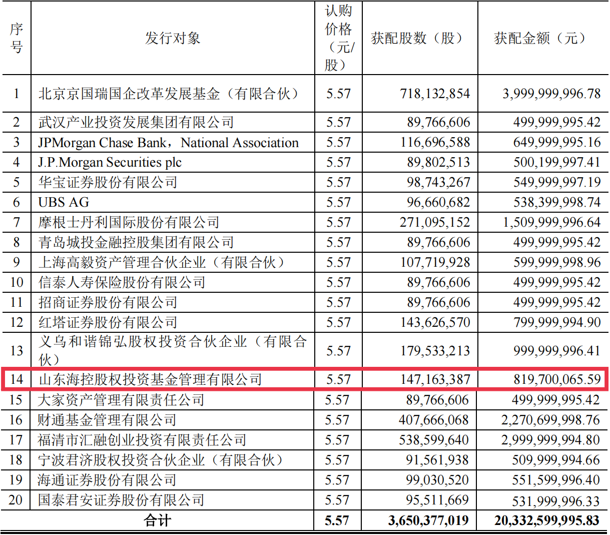 8月18日,京東方A(00725)披露非公開發行A股股票發行情況報告書,共發行股票36.5億股,募集資金203.33億元,海控集團旗下基金公司—山東海控股權投資基金管理有限公司(以下簡稱“海控資本”)認購約8.2億元,成功完成資本市場首秀。