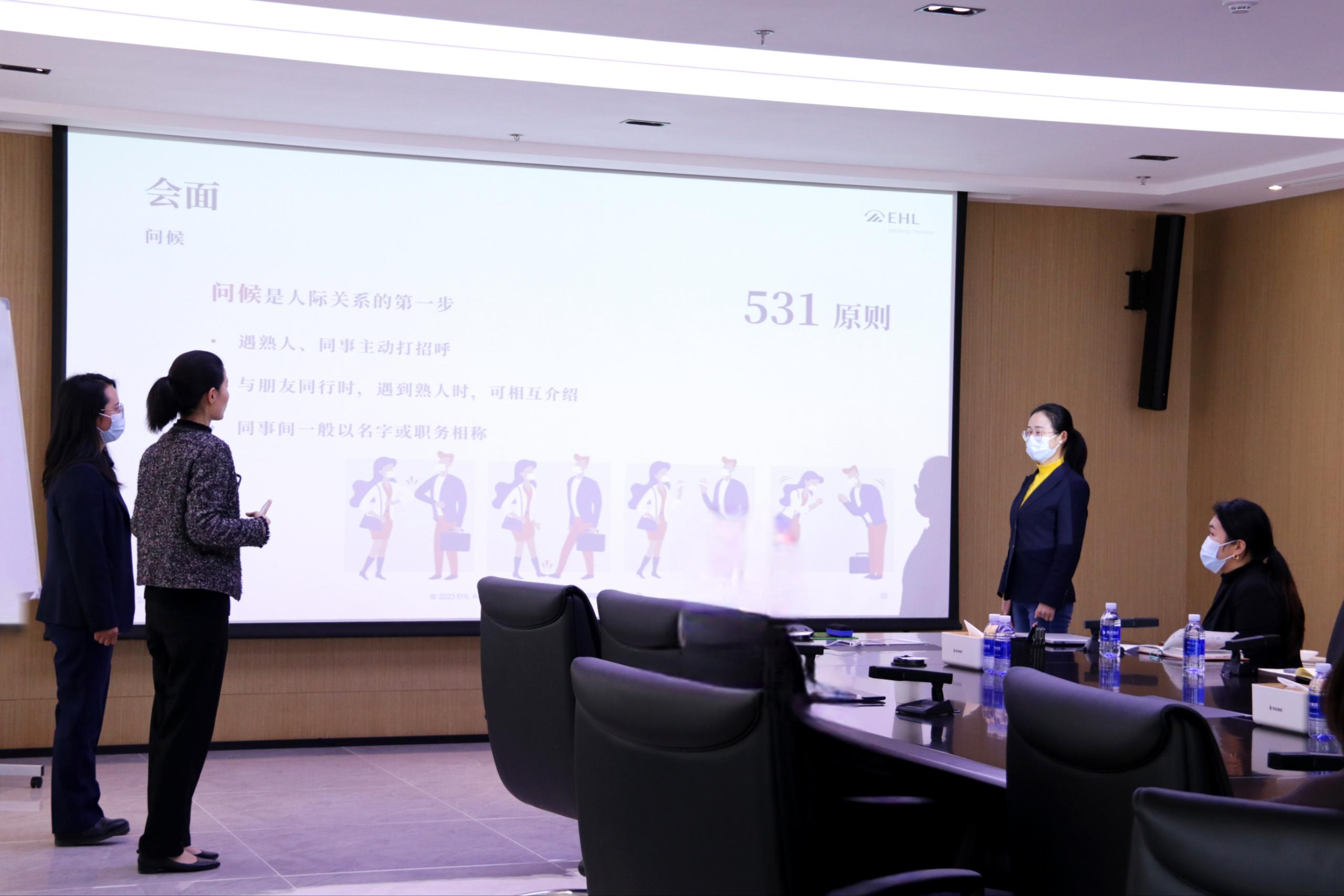 此次培訓(xùn)邀請(qǐng)了洛桑酒店管理學(xué)院集團(tuán)咨詢公司顧問呂堃講師、助理顧問謝一晗講師針對(duì)商務(wù)禮儀進(jìn)行授課。在培訓(xùn)中,兩位培訓(xùn)講師采取理論教學(xué)和現(xiàn)場互動(dòng)實(shí)踐相結(jié)合的方式。一方面,通過援引事例生動(dòng)闡釋商務(wù)禮儀的概念、作用、行為標(biāo)準(zhǔn)等理論知識(shí);另一方面,通過場景模擬實(shí)踐、特定情境互動(dòng)表演等環(huán)節(jié)詳細(xì)示范和訓(xùn)練禮儀規(guī)范。參訓(xùn)人員即學(xué)即練,在現(xiàn)場實(shí)踐互動(dòng)中加深了對(duì)商務(wù)禮儀的理解和把握。