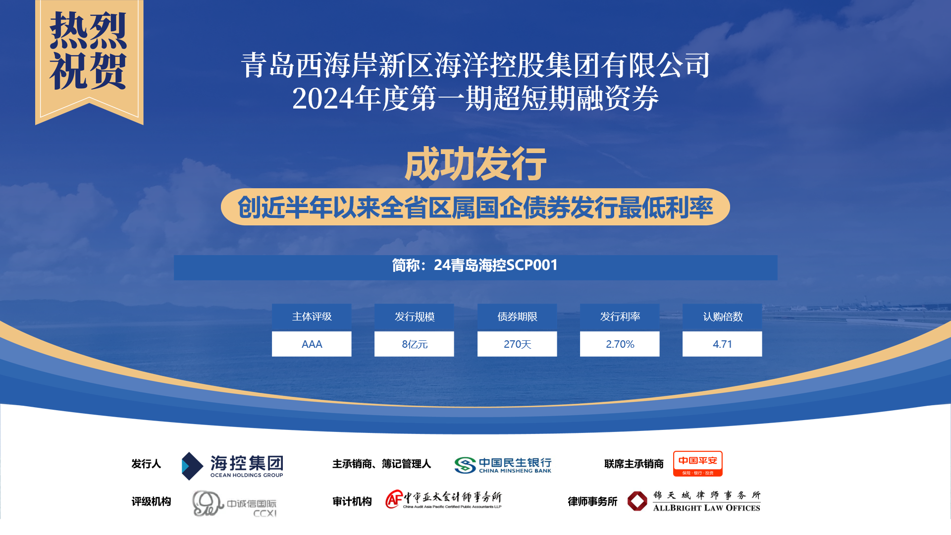 集團(tuán)2024年債券發(fā)行“開(kāi)門紅”體現(xiàn)了資本市場(chǎng)對(duì)海控集團(tuán)的高度認(rèn)可。海控集團(tuán)將繼續(xù)深化產(chǎn)業(yè)化轉(zhuǎn)型成果,拓展多元融資渠道,為西海岸新區(qū)高質(zhì)量發(fā)展做出更大貢獻(xiàn)。